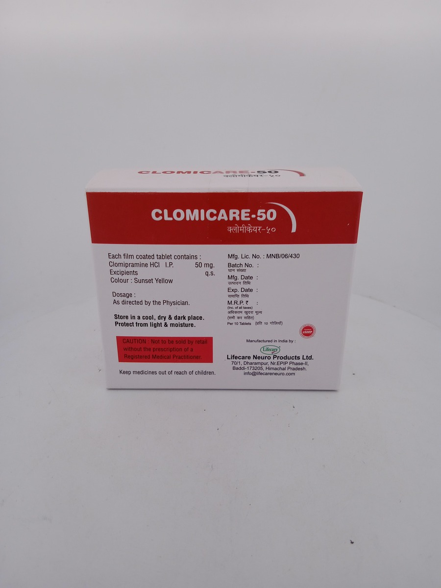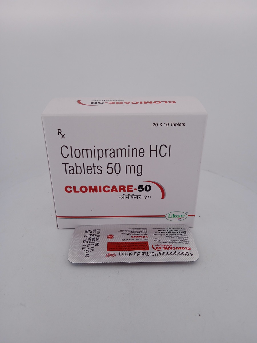 CLOMICARE 50 MG, featuring Clomipramine, is a medication primarily used to treat major depressive disorder and OCD. It helps alleviate symptoms such as low mood, anxiety, and persistent unwanted thoughts or repetitive behaviors seen in OCD. By acting on the serotonin and norepinephrine neurotransmitters in the brain, CLOMICARE helps stabilize mood and reduce obsessive and compulsive behaviors.