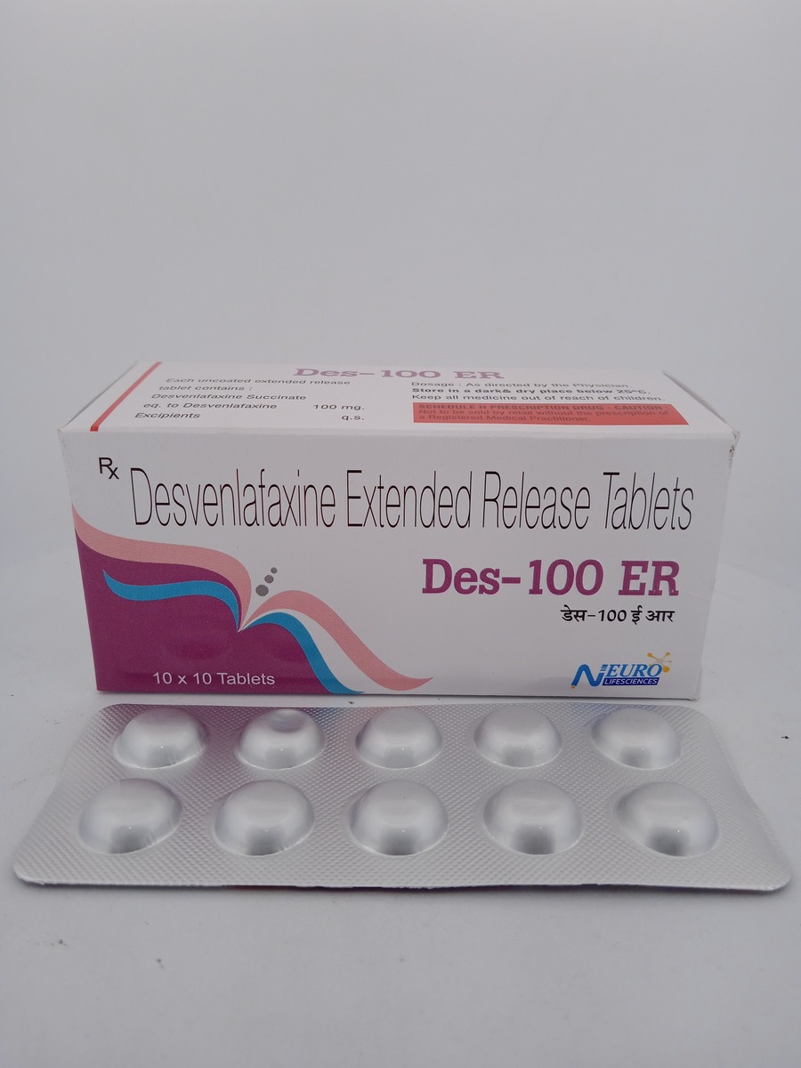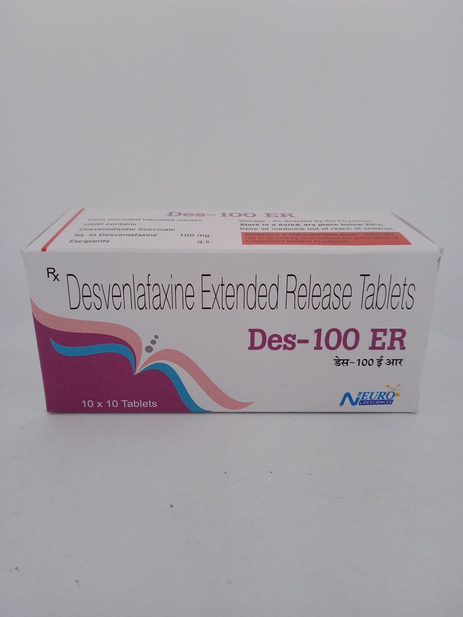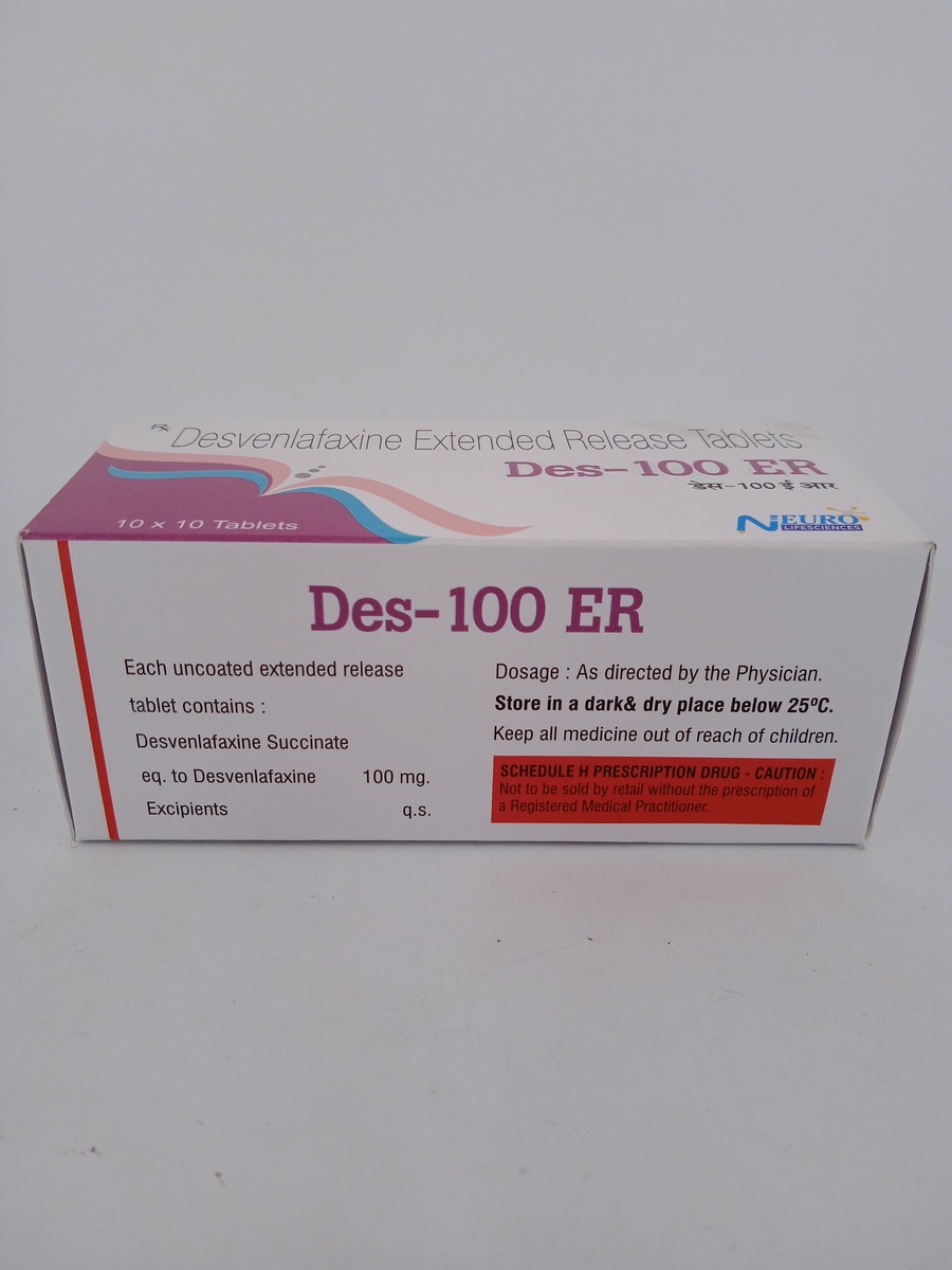 DES 100 ER contains Desvenlafaxine, a serotonin-norepinephrine reuptake inhibitor (SNRI) used to treat major depressive disorder. This medication works by increasing the levels of neurotransmitters, serotonin and norepinephrine, in the brain, which helps improve mood and alleviate feelings of sadness. Designed for extended-release, DES 100 ER provides sustained therapeutic effects, ensuring stable mood levels throughout the day.