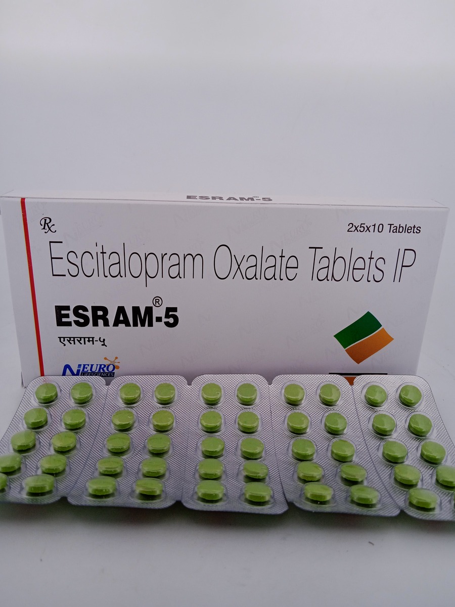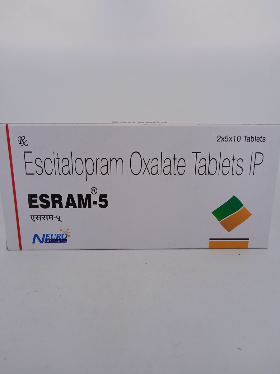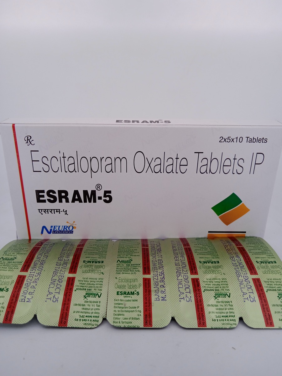 ESRAM 5 MG contains escitalopram, an SSRI that works by increasing serotonin levels in the brain, a neurotransmitter crucial for mood regulation. This medication effectively alleviates symptoms of depression, anxiety disorders, and panic attacks, promoting emotional stability and enhancing quality of life.