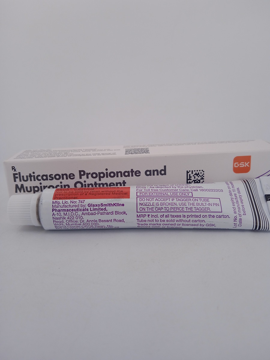 FLUTIBACT Skin Ointment contains two active ingredients, Fluticasone (a corticosteroid) and Mupirocin (an antibiotic), which work together to treat skin infections. Mupirocin fights bacterial infections by stopping the growth of bacteria, while Fluticasone reduces inflammation, redness, and itching. FLUTIBACT is ideal for treating infected wounds, impetigo, and dermatitis.