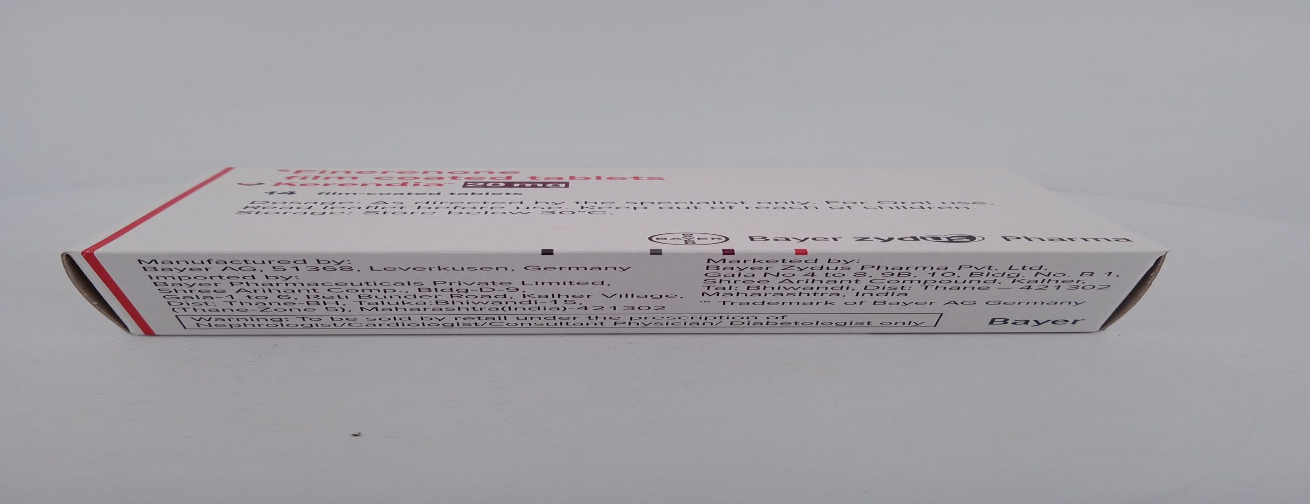 KERENDIA 20 MG contains Finerenone, a non-steroidal mineralocorticoid receptor antagonist (MRA). It is used for the treatment of chronic kidney disease (CKD) associated with type 2 diabetes. Finerenone works by blocking the mineralocorticoid receptors in the kidneys, which helps reduce inflammation and fibrosis, thereby slowing the progression of kidney damage. KERENDIA is prescribed to patients who need effective management of CKD to improve kidney function and overall health.
