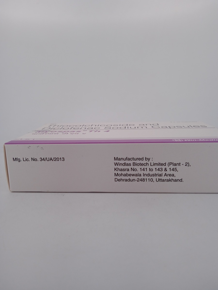 MYOSPAS TH 4 contains Thiocolchicoside, a muscle relaxant that helps reduce muscle stiffness and spasms, and Diclofenac, a non-steroidal anti-inflammatory drug (NSAID) that reduces pain and inflammation. This dual-action formula is highly effective in treating musculoskeletal conditions, offering relief from pain and improving mobility. It is commonly used for back pain, neck pain, and injuries caused by physical strain.