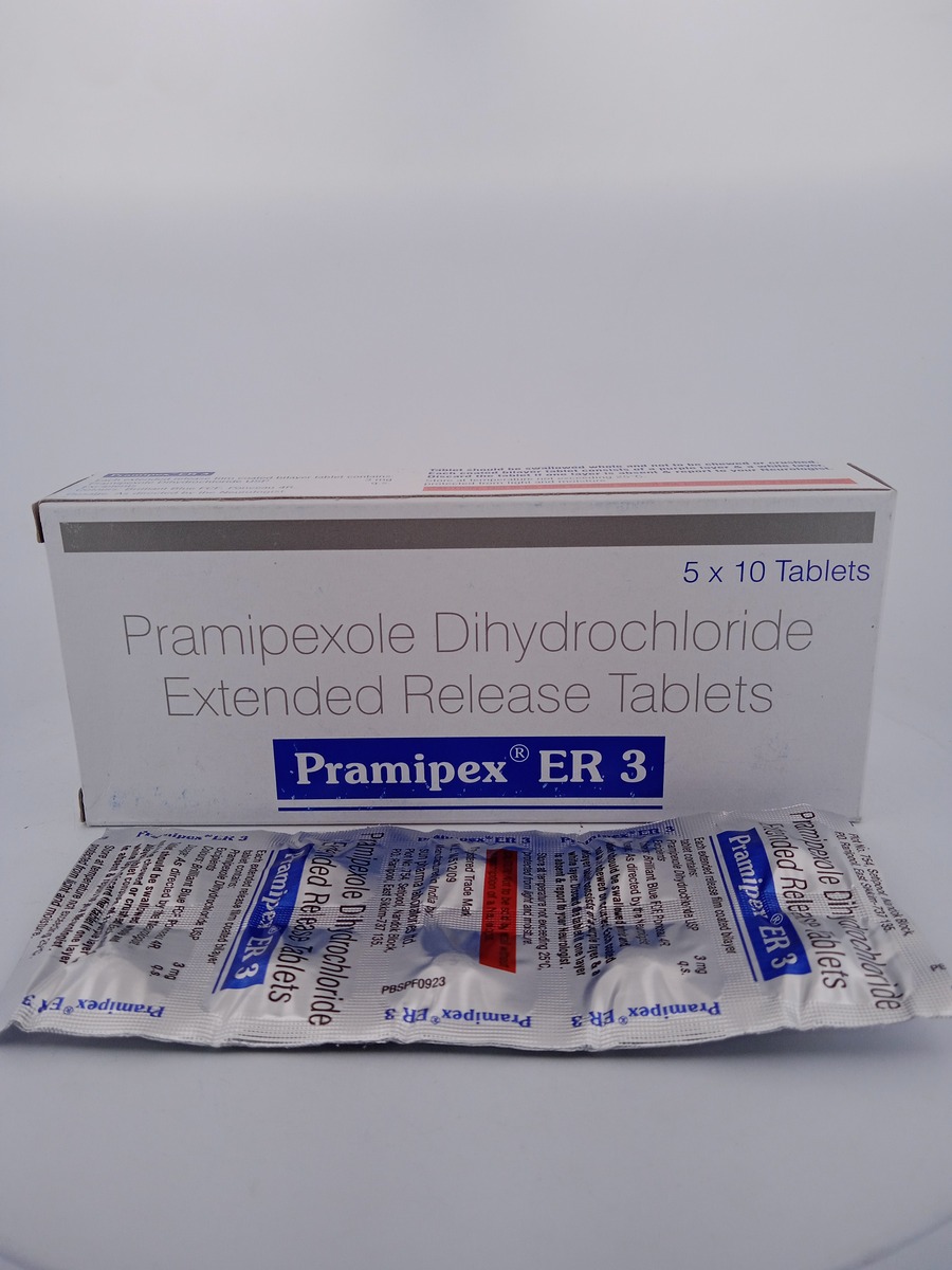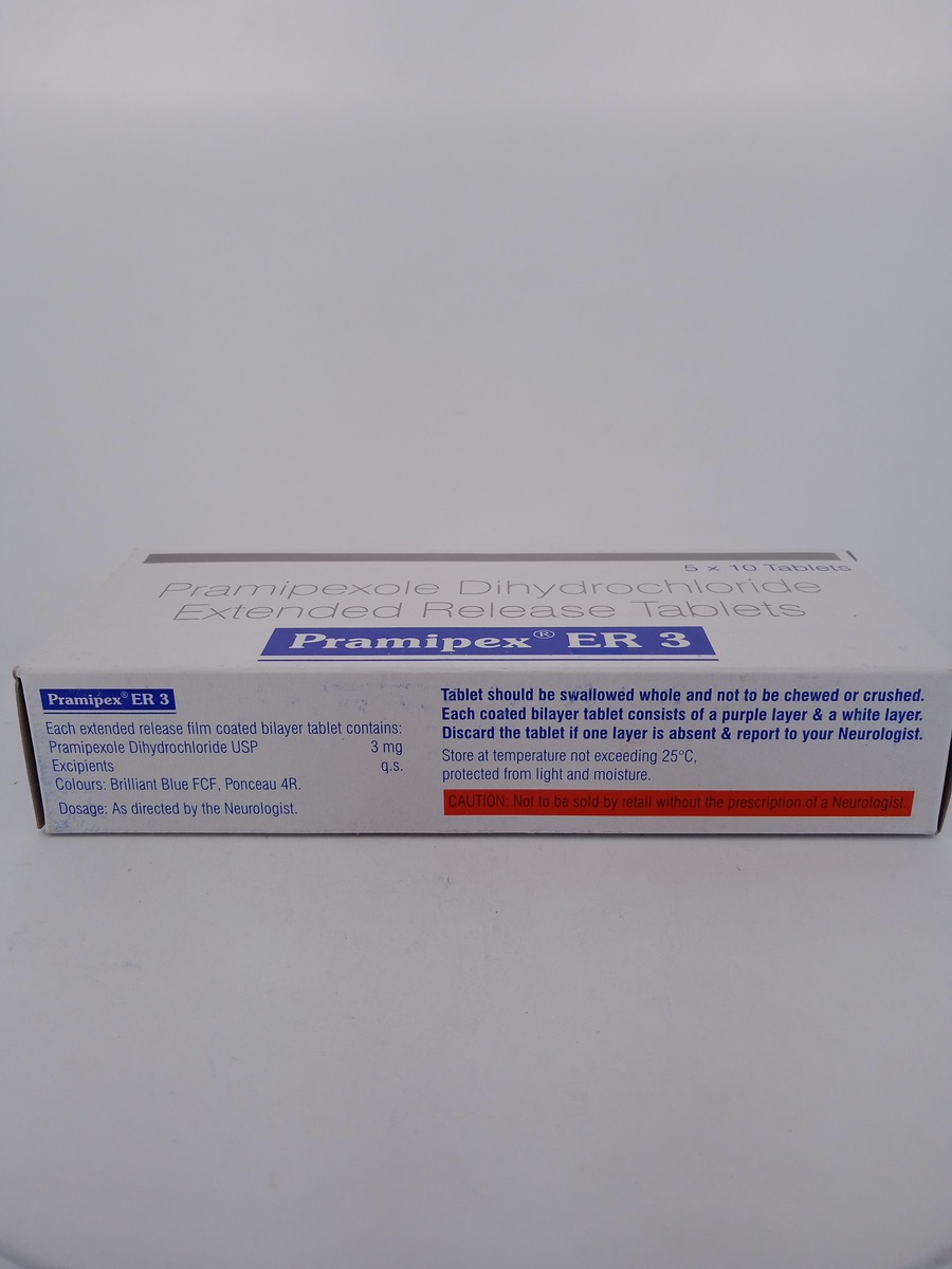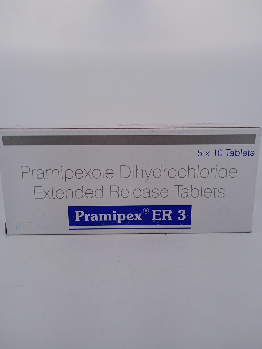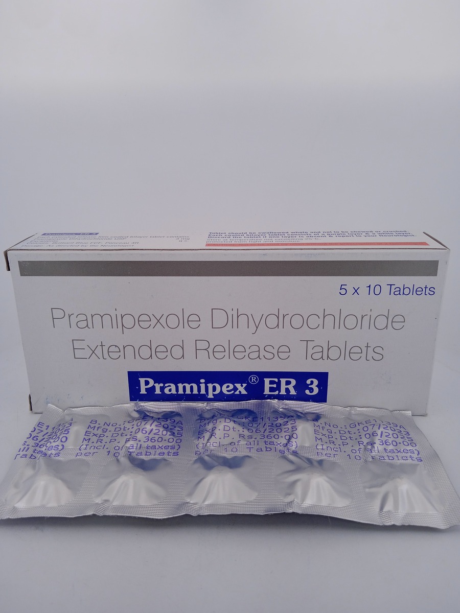 PRAMIPEX ER 3 MG is an extended-release tablet that contains pramipexole, a dopamine agonist. It is used to treat Parkinson’s disease and restless legs syndrome (RLS) by maintaining stable dopamine levels in the brain. This helps alleviate symptoms such as tremors, rigidity, and restlessness, offering improved motor control and enhanced quality of life. The extended-release mechanism ensures long-lasting effects, reducing the frequency of dosing.