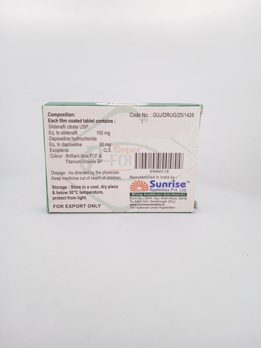Super P-Force contains two active ingredients: sildenafil citrate and dapoxetine. Sildenafil citrate, a phosphodiesterase type 5 (PDE5) inhibitor, enhances blood flow to the penis, promoting firm and long-lasting erections. Dapoxetine, a selective serotonin reuptake inhibitor (SSRI), helps delay ejaculation, allowing for greater control over ejaculation timing and prolonging sexual activity.