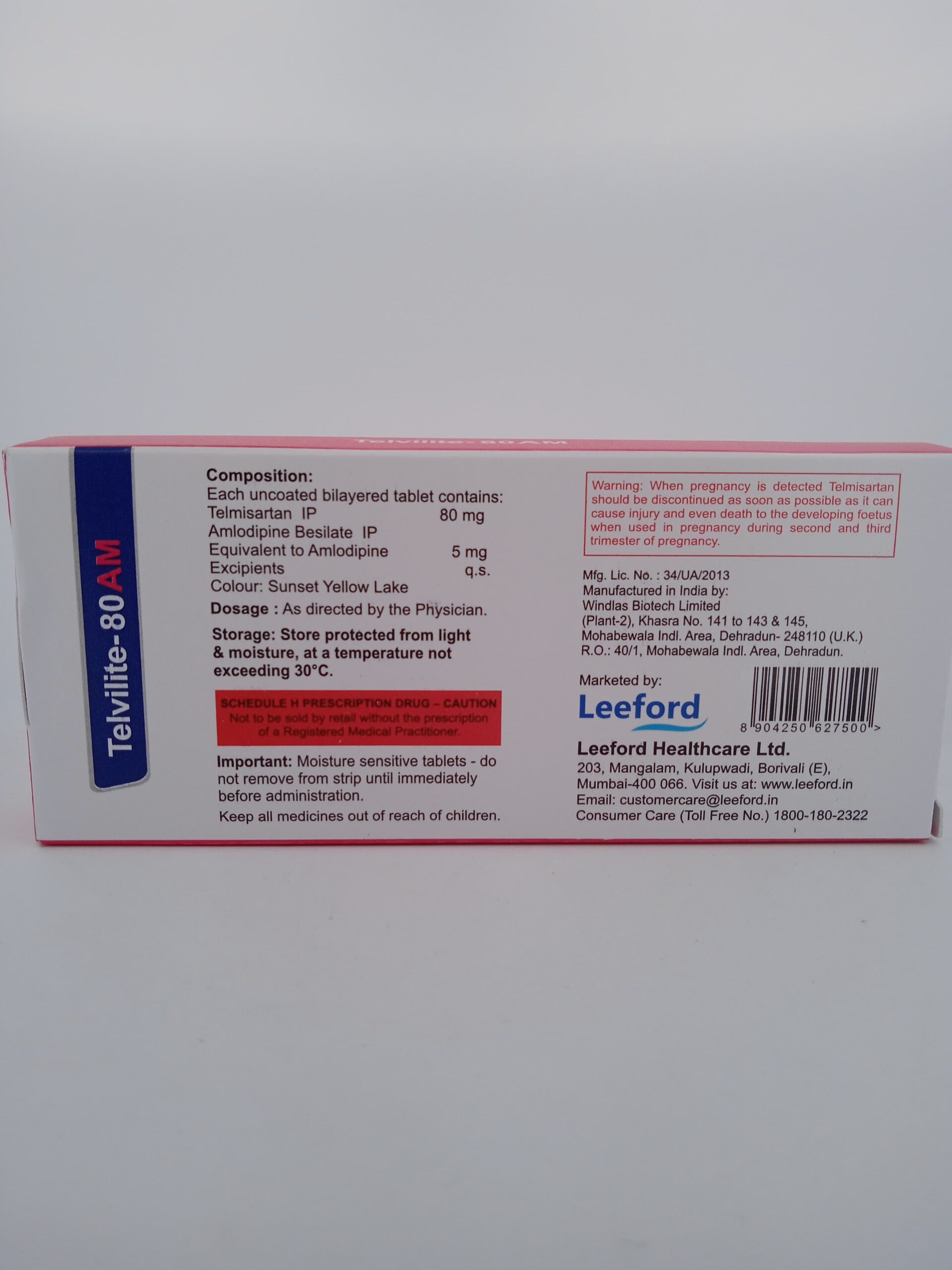 Dosage: Follow your healthcare provider’s instructions for dosage. Typically, one TELVILITE-80 AM tablet is taken once daily.