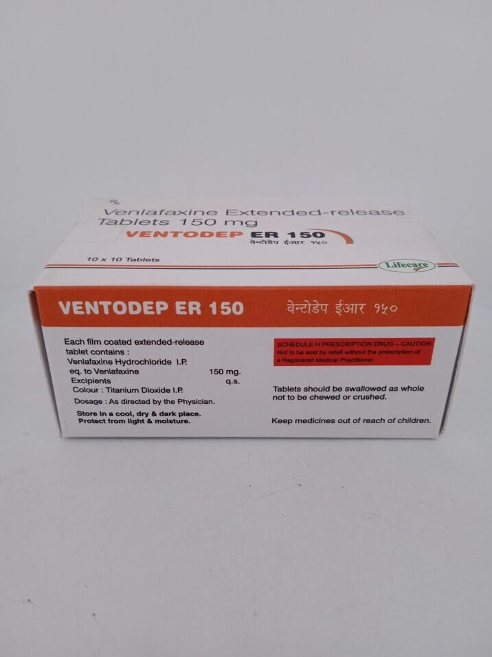 VENTODEP ER 150 MG is an extended-release version of Venlafaxine, an SNRI prescribed for major depressive disorder (MDD), generalized anxiety disorder (GAD), and panic disorders. By balancing serotonin and norepinephrine levels in the brain, this medication improves mood, reduces anxiety, and helps manage panic attacks. The extended-release formulation ensures that the medication is released gradually throughout the day, providing consistent relief from symptoms and maintaining emotional stability.